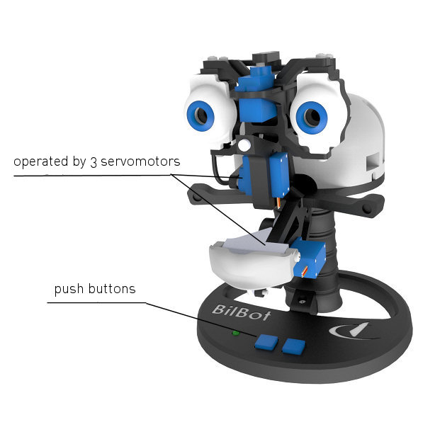 The kit is equipped with 3 servomotors, one to control the movement of the mouth and 2 others to control the movements of the eyes.